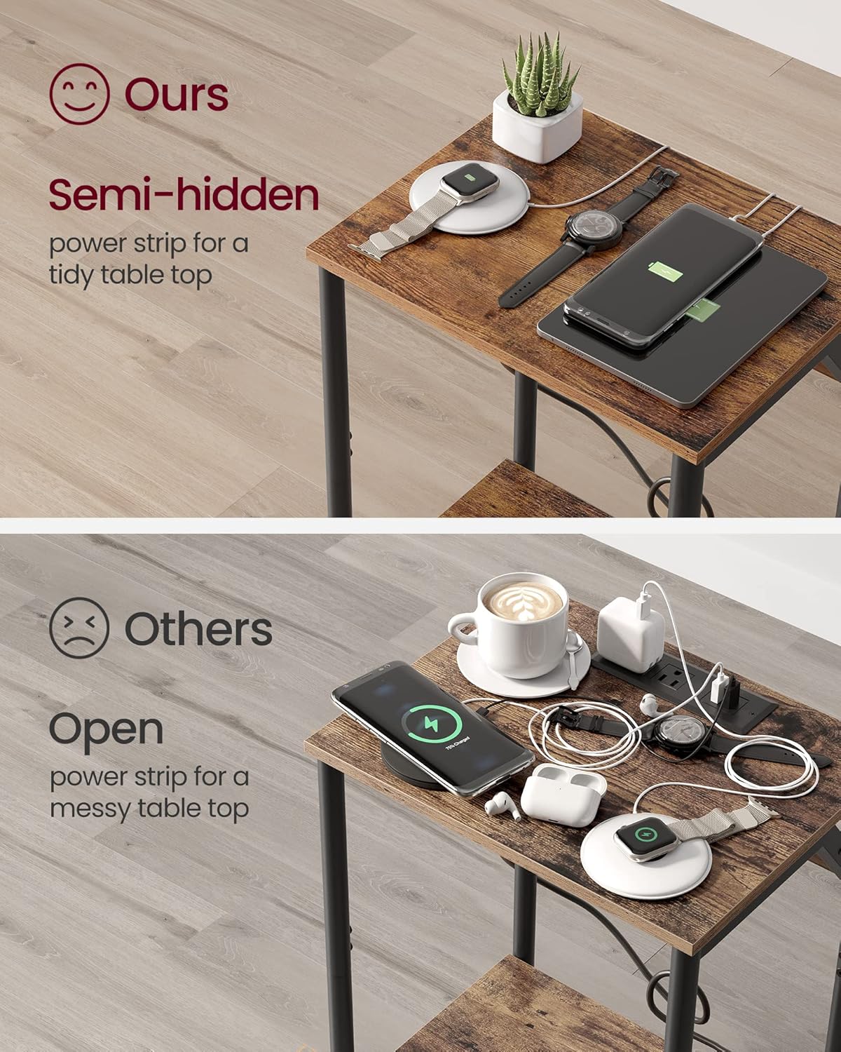 WARNING: This product Table with Charging Station, set of 2, Small Side Tables for Living Room, Bedroom, Nightstand with Outlets and USB Ports, Bedside Table with Storage Shelf, Rustic Brown and Black requires assembly. Always follow the instructions provided. Do not exceed the maximum weight limit of 66 lb (30 kg) for the table top and 44 lb (20 kg) for the bottom shelf. Ensure the product is stable and properly anchored to prevent tipping or collapse, especially in tight spaces.